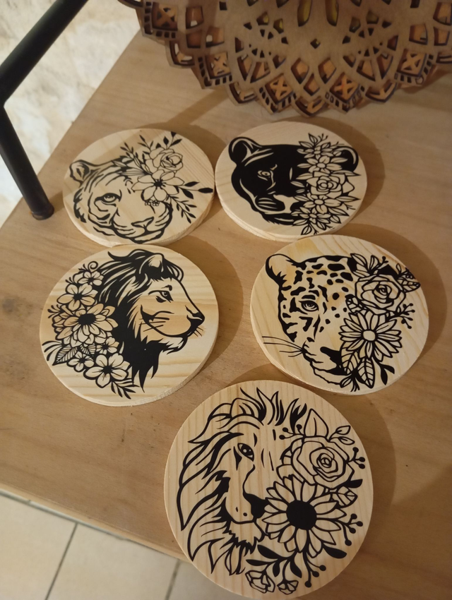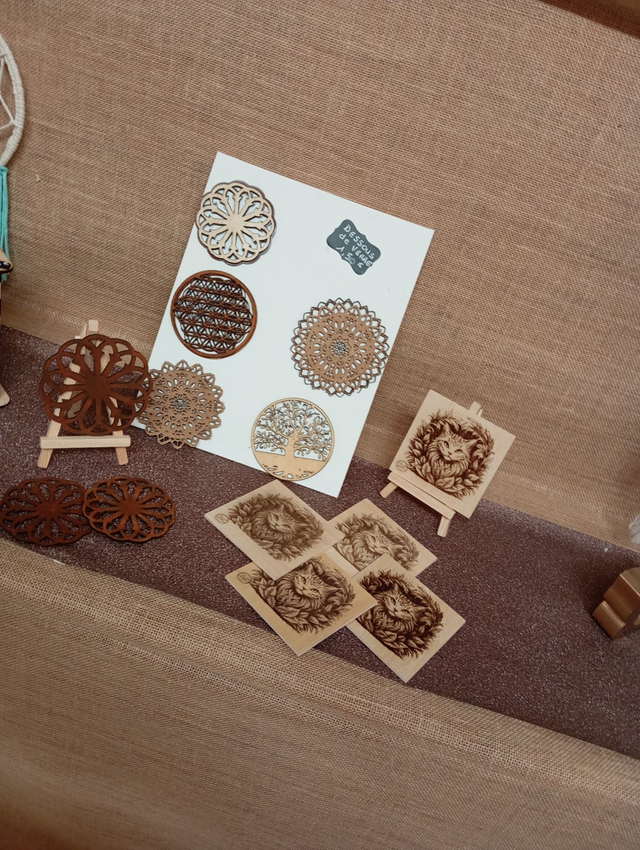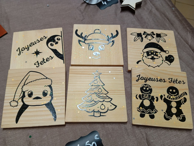 Dessous de verres en bois , plusieurs modèles en exemple possibilité de faire des demandes , ils sont au prix de 1€50 l'unité.
