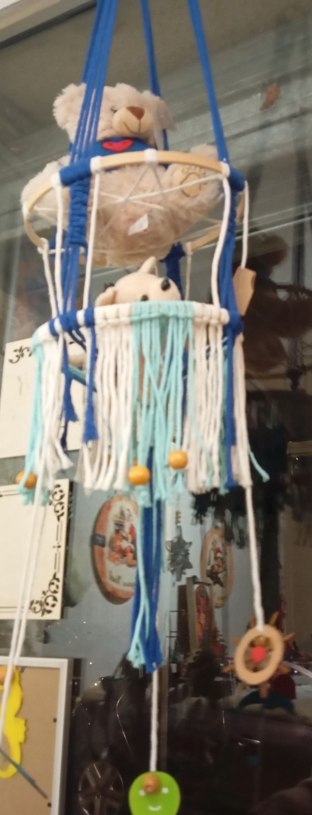 Suspension en macramés sur le thème de la mer dans les tons bleutés , avec des petites figurines de la mer réalisées en bois , accompagnés de ses petites peluches.
